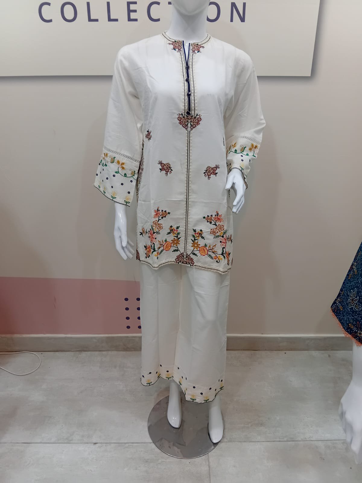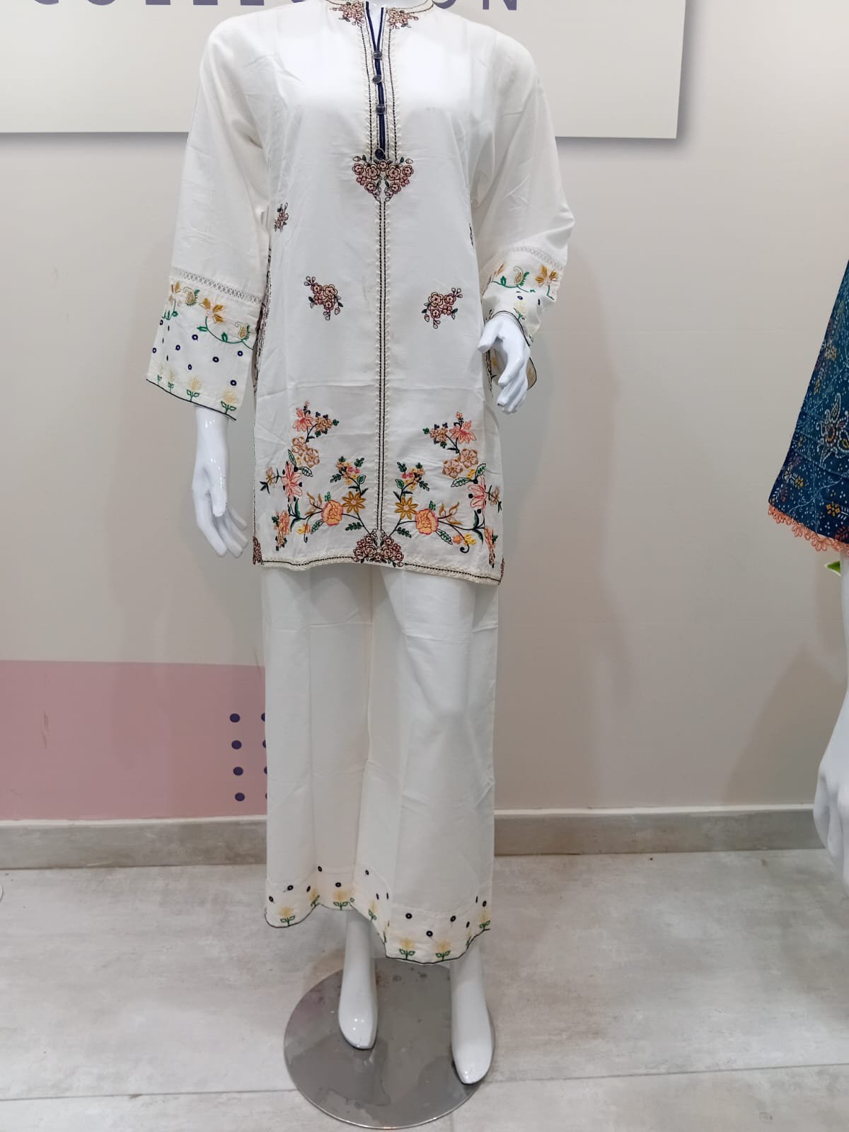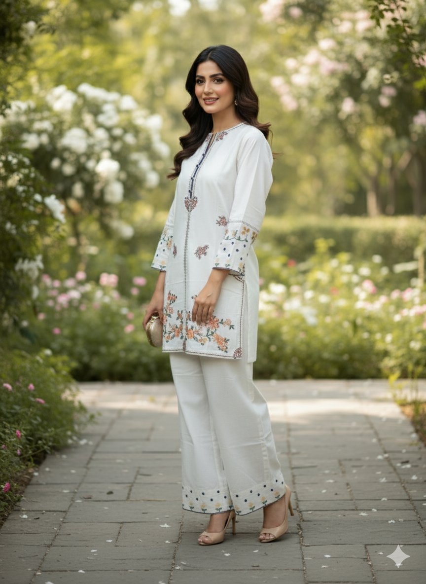 Step into a world of elegance with this beautiful white kurta and palazzos set. Made from high-quality cotton, this outfit is designed for both comfort and style. The classic straight-cut kurta is adorned with intricate, multi-colored floral embroidery along the neckline, sleeves, and hem. The wide-leg palazzos feature a matching embroidered border, creating a cohesive and graceful look. Perfect for casual outings, festive occasions, or a relaxed day, this versatile ensemble pairs beautifully with heels or flats.